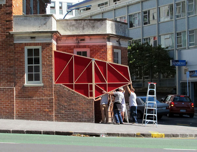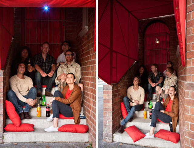 建筑设计团队OH.NO.SUMO在奥克兰的街头设计了一项有趣的公共设备。用一顶醒目的红色顶棚与现有建筑做了个很好的衔接,顶棚里面还可以通过互联网电视观看一些影视短片。这一举动引起了很多市民的关注和围观,这一友好的设计不但可以给候车的路人提供一个歇脚的地方,还能成为三五好友的一个微型聚集地。