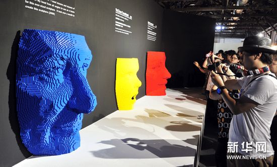(3)7月14日,参观者在“积木梦工场”欣赏积木艺术作品。