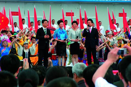 2009年5月,中央电视台主持人白岩松、周涛、董卿、朱军在绵竹二号立交桥板房区参加慰问演出活动。摄影:林兆贵