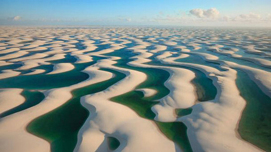 拉克伊斯·马拉赫塞斯国家公园(Lencois Maranhenses National Park)坐落于巴西东北部海岸边,巴西最大规模的岸边沙丘带就位于此地。每年有超过6万的游客来到这占地1550平方公里的国家公园,参观这令人难以置信的生态系统。在这里,被风和洋流塑形成新月型的沙丘可以高达40米。而由于此地丰富的降雨量,在沙丘之间会形成淡水湖。