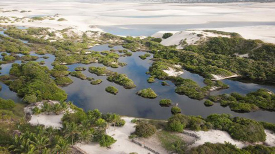 一年之中,公园里的风景会进行一次彻底的转变。一旦到六月份,雨季结束,湖泊里的水会在炎热的的气温下开始蒸发,水面平均一个月能够下降一米。在旱季,从七月到十二月,持续不断的东北风能使沙丘最远向内陆推移48公里,同时也雕刻出了耸立的沙丘。沙洲型湿地——拥有灌木植被的淡水湖泊也是这个生态系统里的一部分。图中为两个最隐蔽偏僻的沙洲湿地中较小的那一个,在Baixa Grande 市内,雨季时它的大部分都会被淹没。