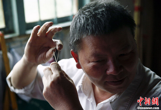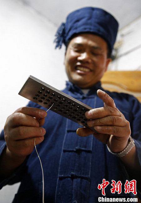 50岁的杨光宾出生在贵州雷山控拜村的一个银匠世家。他13岁就跟随父亲学习银饰制作,如今已是这项祖传技艺的第五代传承人。在杨光宾手中,完成一套苗族银饰作品需要花费30多道工序,有铸炼、锤打、焊接、编结、洗涤等一整套纯手工工艺过程。图为杨光宾进行“丝眼板”抽丝技艺。在“丝眼板”上有粗、细、方、圆不同的眼孔,可以拉出4毫米直径的粗丝,也可以拉出头发丝般的细丝。