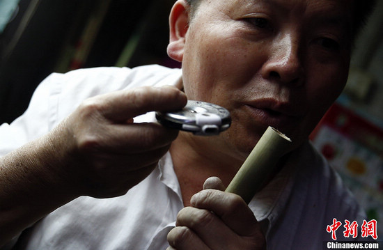 在莫厌学家中,海外订购的电话响个不停。据介绍,莫厌学家每人制作芦笙月收入在2000元左右。不过,由于村里许多人外出打工,莫厌学相当担心传承无人,“现在会吹芦笙的往往是五六十岁的人啦!”图为莫厌学用传统的芦笙定音器测试芦笙音质。