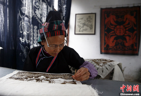 蜡染的制作工艺在中国已有2000多年的历史。在贵州境内的山区,蜡染有着其特殊的传承方式:一般以女性传承为主,苗族姑娘几岁时开始和母亲学习蜡染,十五六岁时就已练就一手娴熟的技艺。图为一名艺人正在绘制蜡画,她不用任何工具,构图全凭个人想象,且作图没有统一固定的版本,所以制作出来的蜡染作品没有一件是相同的。