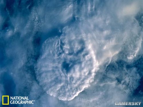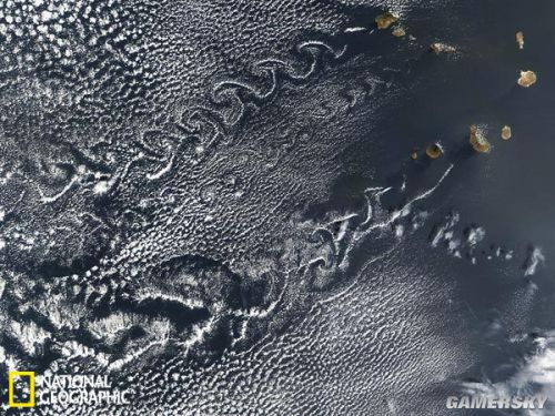 云涡(也叫冯·卡门旋涡)在非洲西北部佛得角群岛( Cape Verde Islands)上空创造出奇特的云图。云涡是由于强风穿过岛屿而形成的。
