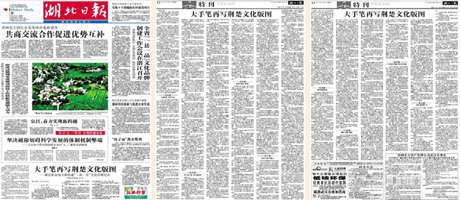 《中国艺术报》5月23日以两个多版的超常规手法推出独家报道《大手笔再写荆楚文化版图》,以2万多字的宏大篇幅对湖北省“一县一品”文化品牌创建工作做了深度报道,引起各方极大反响。7月6日至7日,湖北省“一县一品”文化品牌创建工作会议在湖北省潜江市召开,湖北省委常委、宣传部部长尹汉宁在会上对《中国艺术报》的长篇深度报道表示感谢。7月8日出版的《湖北日报》也以两个多版的超常规手法,全文转载《中国艺术报》记者长篇通讯《大手笔再写荆楚文化版图》,将这篇报道的影响继续推向深入,共同推动“一县一品”文化品牌创建工作由文联主导成为全省统筹推进、助力湖北文化强省建设的发展战略。
