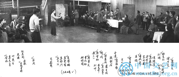 我编中央歌剧院“院报”期间,有一天光羲老师来到我的办公室,给了我一幅长卷的黑白照片。他指着照片给我讲:“这是当年排《茶花女》时一位记者拍的。那时的排练场,条件很差,就是在四合院中间的大棚下排戏。这是我找人帮我将好几张照片拼起来的全景,我在下面把我能认出来的人都标出名字了。有点价值吧?”
