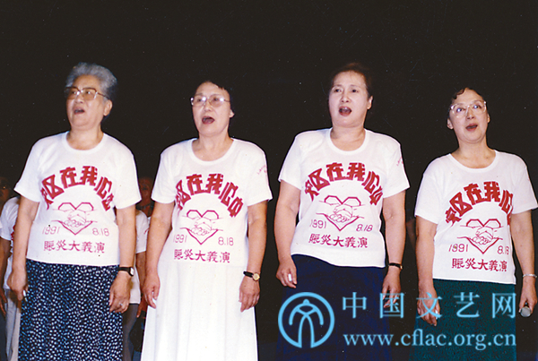 1991年,张瑞芳、白杨、秦怡(右二)、王丹凤等参加赈灾大义演