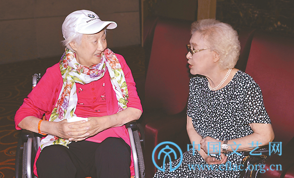 2015年8月,秦怡(右)在赵丹诞辰100周年纪念座谈会上与黄宗英亲切交谈