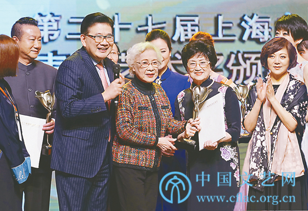 2017年4月,第27届白玉兰奖颁奖仪式上,秦怡为越剧表演艺术家王文娟颁发终身成就奖