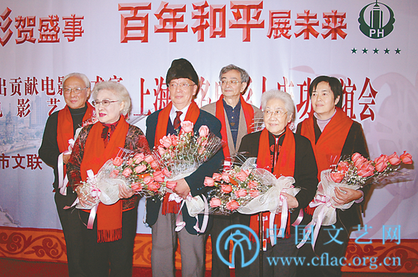 2006年1月,秦怡(前排左一)在荣获“国家有突出贡献电影艺术家”、“优秀电影艺术家”上海著名电影人庆功联谊会上