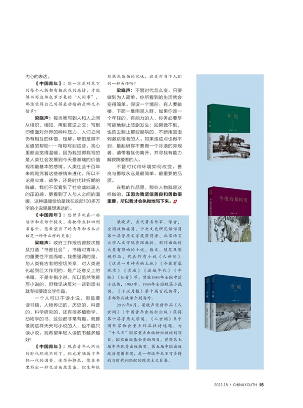 《中国青年》2022年第4期发表的《专访梁晓声:用〈人世间〉,写就温暖人间事》一文中,梁晓声分享了对文学创作的真知灼见和对“好人文化”的推崇,本文特此节选了部分内容,以飨读者。