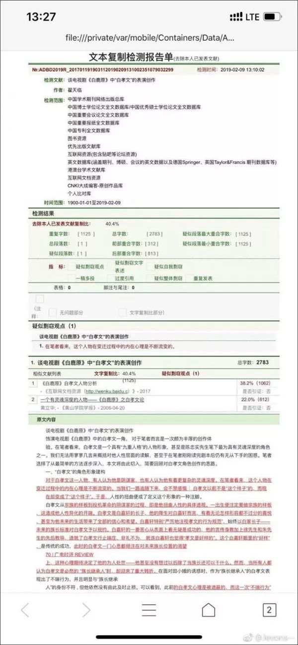 由于他的《谈电视剧<白鹿原>中“白孝文”的表演创作》一文的查重检测报告显示相似度超过50%、知网上文字重复比为40.4%,总字数2783的文章中重复字数多达1125个。与此文有超高相似度的两篇文献是发表于多年前的《一个有灵魂深度的人物——<白鹿原>之白孝文论》和《<白鹿原>白孝文人物分析》。因此众多网友对他取得的博士学位提出质疑,并进一步对他被北京大学光华管理学院聘为博士后研究人员提出质疑。