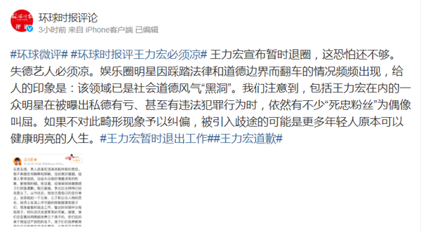 环球时报评论:王力宏宣布暂时退圈,这恐怕还不够。失德艺人必须凉。娱乐圈明星因踩踏法律和道德边界而翻车的情况频频出现,给人的印象是:该领域已是社会道德风气“黑洞”。我们注意到,包括王力宏在内的一众明星在被曝出私德有亏、甚至有违法犯罪行为时,依然有不少“死忠粉丝”为偶像叫屈。如果不对此畸形现象予以纠偏,被引入歧途的可能是更多年轻人原本可以健康明亮的人生。