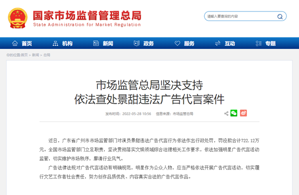2022年5月28日,市场监管部门公开曝光了演员景甜违法广告代言案的查处情况。经查明,广州无限畅健康科技有限公司选用景甜为其生产经营的“果蔬类”食品作广告代言,相关“果蔬类”食品为普通食品,该公司无有效证据证实其具有“阻止油脂和糖分吸收”功效。景甜在应知法律法规规定普通食品依法不得进行治疗、保健等功效宣传,且未经有效途径对代言商品有关功效进行核实的情况下,仍以自身名义和形象在广告中宣称代言商品具有“阻止油脂和糖分吸收”功效,其行为已违反广告法有关规定。景甜上述广告代言违法所得共计257.9万元。广州市天河区市场监管局依据《中华人民共和国广告法》第六十一条的规定,对景甜作出没收违法所得,罚款464.22万元(罚没金额合计722.12万元)的行政处罚决定。