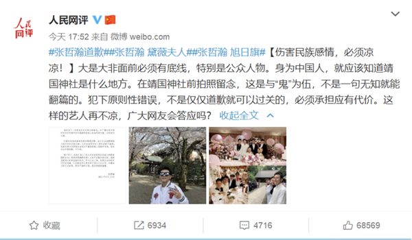 人民网评论:大是大非面前必须有底线,特别是公众人物。身为中国人,就应该知道靖国神社是什么地方。在靖国神社前拍照留念,这是与“鬼”为伍,不是一句无知就能翻篇的。犯下原则性错误,不是仅仅道歉就可以过关的,必须承担应有代价。这样的艺人再不凉,广大网友会答应吗?