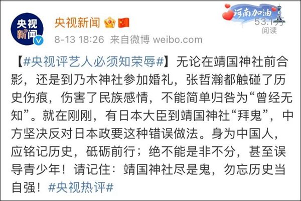 央视新闻评论:无论在靖国神社前合影,还是到乃木神社参加婚礼,张哲瀚都触碰了历史伤痕,伤害了民族感情,不能简单归咎为“曾经无知”。就在刚刚,有日本大臣到靖国神社“拜鬼”,中方坚决反对日本政要这种错误做法。身为中国人,应铭记历史,砥砺前行;绝不能是非不分,甚至误导青少年!请记住:靖国神社尽是鬼,勿忘历史当自强!