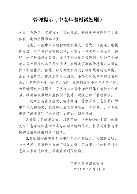 近日,广电总局网络视听司连续发布两个管理提示,对于当前在中老年题材和所谓“霸总”题材微短剧创作中出现的不良倾向,进行及时提示和规范,推动微短剧创作持续向上、向善、向美。