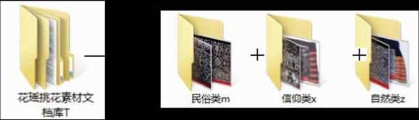 资料整理按照挑花文化素材的属性及内在的逻辑关系进行有序的排列分类与层层解构,最终形成能记录挑花多重信息的、有秩序的文档库。