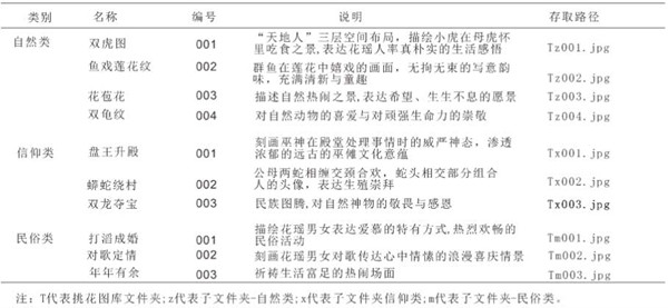 花瑶挑花图案一般运用在服饰上,通常男装色彩的装饰和颜色偏单调,女装则装饰繁多、色彩华丽。挑花图案丰富,主要分为动植物、故事传说、民俗三类题材,呈严格的左右对称和纵向三层空间(天、地、人)形式布局,横向或纵向以二方连续方式排列。自然题材类纹样取材于周边自然环境、经花瑶人们运用主观想象抽象加工而成,有杯嘎哟、牡丹纹等,种类最多;历史信仰类是花瑶历史传说、图腾文化、生殖崇拜集合的视觉表现,如巫傩文化、乘龙过海、蛇图腾等;民俗类展现了花瑶独特的历史生活、习俗,如打滔成婚等。由上分析,图案包括了纹样、色彩、内涵、工艺等完整信息,因此,以图案为分类对象,建立素材文档库T,该库包括自然类、信仰类、民俗类三个子文件夹,将挑花图样按照题材分类存档,并分别编号z、x、m,如图1,图2所示。然后,建立相应的信息一览表,对图案相关信息进行记录,方便按需对照信息表快速找寻目标,如图3所示。
