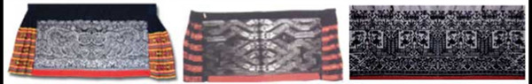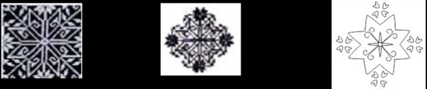 图2 挑花图样(从左至右:双虎图、相交蛇、打滔成婚)