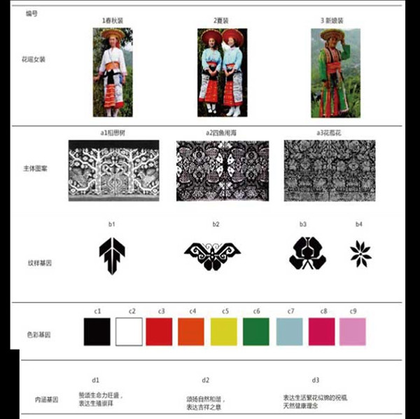 “基因”一词是生物学术语,指具有遗传效应的DNA片段,对生物体的性状表达起着调控作用,文化基因对地域文化或民族文化表现出明显性、延续性特征有着调节作用。在具体的文化创意设计活动中,同样存在影响设计内容和风格的几种关键文化设计因子,这些设计因子的确定不仅能促进文化的发展,还有助于提升设计对象的内涵和价值。因此,将挑花文化基因与设计融合具有可行性和广泛前景。