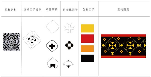 图案重构是对提取的挑花图案加以局部或整体分解,以叠加、增减、比例调整、位置变换等方式对提取的典型纹样、色彩、内涵等因子重新自由组合,构成某些具有象征意义或典型性的符号。如图9所示,对蒂纹变形处理,将柿蒂纹打散为线、面的综合单体形式,产生3个简单的四边形单体,对各个单体变化再组合得到新单体形式,以红、黄、橙、黑四色调和,综合纹样与色彩得到新图案,最后以二方连续排列,得到新的装饰图形。