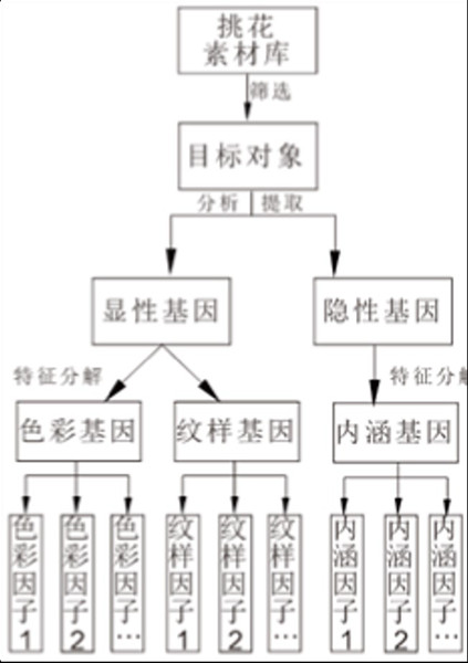 层次分析模型是一种对目标对象层层分离进而定性分析的研究方法。层次分析模型可以对庞大的文化元素信息量层层分类归纳,对设计基因进行从宏观到具体的细化、筛选研究,便于择取挑花图样的主体文化设计基因、去掉细枝末节因素。如图4所示,从文档库中选取目标对象,根据目标对象的特征分离,可得到显性基因和隐性基因,由进一步的属性分析将其分解成具体的设计特征要素,得到纹样、色彩、内涵三种共同的主体设计基因,每一种基因是该类因子的集合,包含了1种以上设计因子。其中,纹样因子和色彩因子属于显性基因,内涵因子属于隐性基因,显性基因是指通过清楚直接展现出来的视觉表象因素,隐性基因是隐藏在直观视觉背后的内在深层因素,对视觉结果的产生、过程和生成有着重要支配作用。