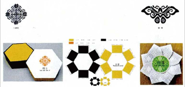 基于对花瑶挑花文化的研究,以当地特产包装穇子粑包装设计为例,验证该研究方法的可行性,如图10所示。由设计诉求出发,设计因子的提取应用过程如下:(1)从图5挑花文化分析图谱中,分别提取了b2、b4纹样因子,c1、c5色彩因子,d3内涵因子;(2)利用现代设计理念对部分显性因子创新:运用简化法提取了八瓣花的主体形态,去除了其他细节,结合重构法中的拉伸等方式得到了一个简单的八瓣新纹样,作为内包装的形态,运用抽象法进一步几何变形,得到六边形的外包装形态。(3)直接运用与间接运用相结合:将蝴蝶纹和八瓣花纹样分别作为装饰部分直接用在外包装和内包装上,外包装上的八瓣花位于空白视觉中心,突出文化元素,内包装上的蝴蝶纹圆满地铺满视觉,符合挑花图案画面饱满的艺术手法,同时,色彩上选择上,选用了在挑花图案主体色—黑色、出现频率较高的黄色,黄色能增加人的食欲,整个包装的文化设计因子和食品诉求一致,传达了天然健康的生态理念。