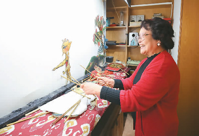 在馆内小剧场,王淑琴会为慕名而来的参观者表演皮影戏。微黄的灯光照在幕布上,一只仙鹤舒展着纤长的脖颈,姿态优美。放下支起仙鹤的杆儿,王淑琴拿起一个小山羊的皮影:“皮影表演还要附带念白和唱腔,你看我要演这小山羊了,又该变嗓子了。这个给孩子们演,他们特别喜欢。”随后,王淑琴又拿出一个表演“高跷秧歌”的影人,邀笔者持杆配合。她一边唱着配乐,一边讲解着怎样让影人的动作更自然。