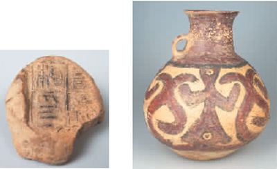 秦右丞相印封泥、马厂类型舞蹈纹单耳高颈壶 古陶文明博物馆供图