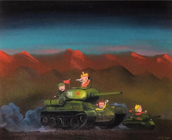 中央美术学院教授王璜生先生谈及捐赠的《创/合20200205》的创作初衷:“无论是自然病毒,还是社会病毒,所造成的侵害创伤,需要我们同心协力去抗争,去医治,去愈合!我用纱布拓印的创作方法,隐喻着我们面对的现实与应有的努力!”著名美术史论家曹星原捐赠的作品《孤寂的永恒》通过对被誉为“东方金字塔”一夯土坵的描绘,尽显西北版王朝文化的磅礴与苍凉,也表达对中国风物历久愈顽强的赞叹。当代艺术圈最具潜力的青年艺术家之一陈建周捐赠的《坦克大战》,意喻很多人都像孙悟空一样将自己对世界的爱藏的无比深沉,不表达,但是却默默爱着。