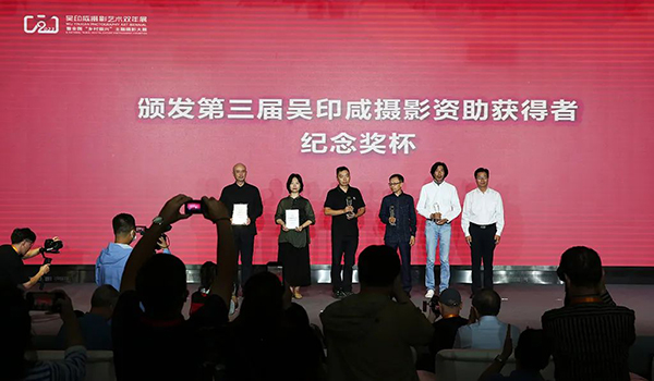 延续往届传统,为弘扬吴印咸的摄影教育精神,激励广大摄影人为推动我国摄影教育事业的繁荣发展做出贡献,本届双年展设立“吴印咸摄影资助计划”,获得高校教师教学创作资助2项,分别是中央美术学院设计学院创作课题《沭阳县乡村及地理文化田野调查》、河南大学美术学院创作课题《当代摄影教育中的乡村振兴图景——以沭阳非遗传承为例》,获得摄影师资助5位,分别是李玉山、王旭、尹永宏、张霆、吕殿杰。陈夫生为获得资助代表颁发纪念杯。