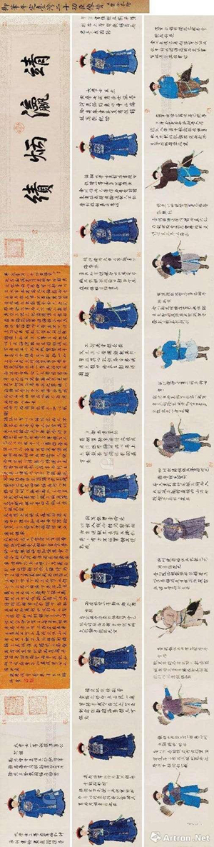 在二级市场中现身的功臣像也多为乾隆时期的作品,例如,在今年保利秋拍中上拍的《成都将军法什尚阿巴图鲁云骑尉鄂辉像》中的人物居紫光阁平定台湾功臣的十一位,出自宫廷画师缪炳泰之手。而早在香港蘇富比2007年秋拍中曾有乾隆《御制平定西域紫光阁次五十功臣像赞》中的三件肖像作品上拍,即头等侍卫卫固勇巴图鲁伊萨穆、二等侍卫特古思巴图鲁以及四十三等侍卫哈什哈巴图鲁达尔汉的画像,虽然这三件肖像画的作者并不能确定,但其绘画风格具有明显的西洋画特征,人物面部具有立体感,设色晕染有明暗区分。在香港蘇富比2011春拍中出现的另一件乾隆《平定西域紫光阁五十功臣像赞》之参赞大臣喀尔喀扎蕯克多罗郡王车木楚克扎布像有着明确的作者记录。此像是中国画师金廷标与西洋画师艾启蒙合作画,这也是乾隆朝功臣像的常见绘制方式。此外,在今年北京保利春拍中推出的乾隆《御笔平定台湾二十功臣像赞》以高达7475万元成交。此画原藏于“春耦斋”,在乾隆时期为消夏茶室书房,由宫廷画家贾全绘制。