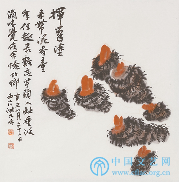 洪亮之所以能够有如此诗情画意,根本在于他对生活的感情。如果对生活没有感情,看什么都没有意义,更不会产生诗兴。洪亮是一个很随和的人,对生活要求不高,但他有生活的情趣。他甘居陋室,但他的画里却充满了他对生活的热爱,充满了他对人生的追求。“挥毫涂来带泥香,童年佳趣最难忘。芋头入灶垂涎滴,味觉催余忆故乡。”这首写芋头的诗把他的童年乡愁写得惟妙惟肖,同时也把诗情与真情表达得清清楚楚。