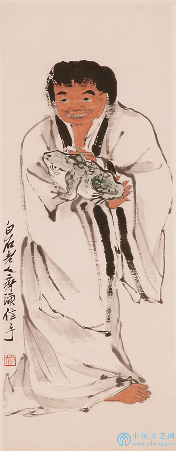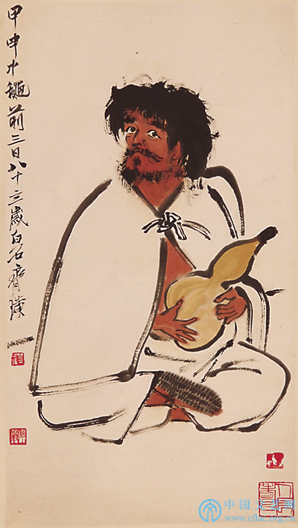 中国美术馆所藏的15件齐白石的人物画作品中,根据有年款的作品统计,创作年代从1894年的《寿翁》(郭子仪)到1947年的《得财》,年代跨度有53年。其中道释人物画6件,现实题材人物画6件,古代人物画2件,不倒翁画1件。他笔下的神仙全无仙气,比如佛是一位慈眉善目的老人,铁拐李分明就是一个衣衫褴褛的乞丐。以中国美术馆的藏品为例, 1916年他创作的《采药仙女》就是一位纯真美丽的人间少女,身姿婀娜。《赤足大仙》中捧着金蟾的大仙,宛然就是湖南常德那位事母至孝的刘海。他的讽刺与幽默多表现在“铁拐李”和“不倒翁”等题材之中。作于1944年中秋节前三天的《捧葫道人》,画中蓬头垢面的道士坐在地上,手里捧着一只葫芦,双眼向天,滑稽而俏皮。画中的道士应是铁拐李,齐白石特别喜欢以铁拐李为绘画对象,其中也有自喻的成分。因为世人多为势利眼,以衣冠取人,他们视铁拐李为乞丐,而不知他实为神仙。齐白石初到北京之时,画坛上有些人视他为来自湖南农村的乡巴佬,所以他画铁拐李以抨击世风之凉薄。他多次以《不倒翁》为题,通过题画能够读解出他对“无肝胆,有官阶”的官员的憎恶。他的风趣与幽默则体现在《钟馗搔背图》中,画中的钟馗被小鬼挠不到痒处,气急败坏的样子,简直活脱脱就是一个邻家老头。