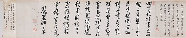 此卷尾处有梁壑子跋,即清代画家刘彦冲。后又有历史学家邓之诚(1887—1960)作跋并题七绝两首,读之颇能引发观者沉浸于沈周画中语境。邓氏诗、跋均未收入其所著《骨董琐记》,仅在当时(1954年)日记中大略记载此事,故予誊录聊补未睹者之憾。所题为:“题沈周萱草葵花卷子。昔年友人袁珏生(即袁励准)得石田画卷,一作葵花,一杂花幛子,诧为奇遇。予为题五古各一章,以称美之诗,载拙集中。今年,名凯(笔者从卷中鉴藏印得知为高名凯)同学复得此本,尺幅若一,画法益精,其诗尤有寄托。幸得借观,为之眼明,因题二绝句:向日忘忧共一家,山中处士玩物华;豪端未必予颜色,嬾画人间富贵花。(芳华误物华)远水遥山寄意深,为同太古结知音;偶然流露忠和孝,未冷当初一片心。甲午冬十一月,文如居士邓之诚题于成府村居。”诗中“偶然流露忠与孝”一句则是指明秋葵和萱花在中国画中的象征和隐喻性。
