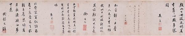 卷后依次有沈周的好友及晚辈学生八家题诗。题诗围绕吟咏“萱堂”、感念母恩为主题。诗文、书法焕然而成佳赏,洵为明代艺坛、文苑弘扬孝道之盛举。计有:一、祝允明:“缬芳堂背有慈颜,人老如今玉瘗山。风木长思原孝子,又堪萱事已阑删。”二、吴奕:“昔为忘忧树此萱,北堂慈色映华颜,如今母没花仍萎,寸草心悬梦寐间。”三、吴爟:“苒苒萱花翠带长,花前莱彩几称觞。白头人去慈围冷,孝子悠思死不忘。”四、徐祯卿:“红萱韡韡土膏柔,人为宜男性雅投。此日开编歌陟圯,花前难说共忘忧。”五、盛甫:“北堂难觅返魂香,一种宜男孝思长。哀恨已枯双眼血,却疑颜色在羹墙。”六、文征明:“北堂寂寞耿余哀,旧日忘忧安在哉。颜色屋梁依落月,夜深疑向梦中来。”七、王渭:“君来索我咏种蘐,我亦种萱二十年。援笔未濡先感泣,泪花交落研池边。种蘐因为母忘忧,岁岁花开对白头。今日母亡萱亦萎,涕洟长向北堂流。”八、顾可学:“树背余阴事已幽,谁言萱草可忘忧。根连古砌情无尽,香散轻帘梦未收。寂寞西风残叶夜,潇踈寒雨满庭秋。堂前犹有霞觞暖,独对灵椿喜更愁。”