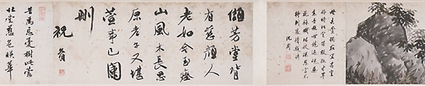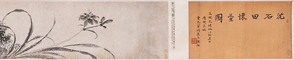 其一《怀萱图卷》,曾由黄宾虹编入《沈石田唐六如张梦晋花卉卷册》,于民国十八年(1929年)神州国光社珂罗版印行,笔者于2021年见于拍卖市场。此卷为纸本水墨,画心纵28.5厘米,横138厘米,卷后并有3.8米之长的各家题跋。是沈周为纪念好友王鏊之母所作,故被冠以“怀萱”之名。沈周至孝,似更能感同王鏊失去母亲的悲痛心情,《诗经·大雅》所谓:“孝子不匮,永锡尔类。”卷中画一萱花旁倚秀石而出,笔墨于松秀中藏苍拙。双钩花茎如弓,一花秀出,一为花蕾,萱叶舒展、弯曲皆有韵致。明代陈淳有自题《萱草寿石图》诗句:“为沾雨露深,颜色晚愈茂。”似可移作此卷写照。沈周在画中自题五言古诗:“母去萱独在,宜男空好时,北堂留故迹,寸草系吾私,世绝返魂药,花余溅泪枝,深恩言不得,到处倩题诗。”诗中“寸草”与唐代孟郊诗句“谁言寸草心,报得三春晖”之“寸草”同指萱花。题诗书法笔势伸展放逸,遒劲奇倔,允为其晚年典型书风。