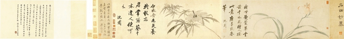 另一为《萱花秋葵图卷》,曾获观于中国美术馆藏品展,为邓拓捐赠。纸本水墨淡设色,纵21.5厘米,横115厘米。分两段,各绘折枝萱花、秋葵一枝,俱呈姿态,颇得写生妙趣。萱花枝茎不同于前卷双钩之法,而用没骨法写出。此卷亦未署年款,但将其笔墨与前卷比较,可见二者创作年代颇近。每段各题五言绝句一首,萱花:“我母爱萱草,堂前千本花。赠人推此意,磨墨点春华。”秋葵:“白衣吾老矣,养我敢忘君。常写葵千本,逢人便可分。”沈周在诗中道明描绘萱花乃是由于母亲对萱花的喜爱。沈周母亲爱萱或许还有晋代周处在《风土记》中所说的原由:“怀妊妇人佩其花,则生男。”沈母膝下计有三子,若果怀此想,算是得偿所愿了。