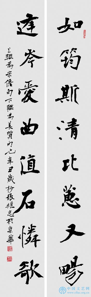如何把北碑中的魏楷变成现代的魏楷,孙伯翔的探索还将北碑的沧桑漫漶与文人的淡泊典雅结合起来,使其魏楷清新有趣,显示出从未见过的书卷之气;李啸的贡献是将变化不定的北碑楷式进行整理规范,呈现和创造出符合现代人审美的辨识分明的体例;而张维忠则是在北碑原有的基础上强化其书写性,让金石刀刻还原于最初的笔墨书写,赋予魏楷更多的灵性。张维忠虽然在书写中受到《圣教序》《书谱》等帖学经典的影响,但还不能将其看作是完整意义的碑帖结合,而是在展览机制发生变化的情况下,对北碑魏楷的现代性改造,因为其基本面貌始终还是魏楷。他强调:“在魏楷书写的过程中,注重法度和速度的同时,还要辩证借鉴其他书体的结字、用笔和意趣。”其创作“由碑入帖,又以帖融碑,碑帖相渗,自然生发。”这些是张维忠对传统魏楷进行改造的秘诀。被张维忠增加了书写性的魏楷,似乎换了一种表情,看上去更加清朗雅逸,富有节奏音韵之感,无论是厚实还是纤秀,都写得轻松、自然,平添了许多个人性情与笔墨的抒情成分,还智慧地把握住了楷与草的分寸,避免了一种超越法度的任性与不伦不类。这反映出张维忠对北碑魏楷书法的不同理解和思考。著名书法家张旭光说张维忠“以魏碑为基,揉入行草笔意,形成了空灵淡雅的魏楷书风。”著名作家、书画家韩静霆将张维忠的书法特色概括为“雨打芭蕉、平沙落雁、一苇渡江、越女新妆。”四句话,四个典故,我理解是有境界、有诗情、有新意、有生趣等。2007年,中国书协原副主席旭宇先生提出的“今楷”理念,曾一度为书坛注目,他认为张维忠这种以魏碑为主的楷书具有时代特点,有“今楷”的意味。李铎、孙伯翔等书法家对张维忠的探索都给予了充分肯定和高度评价。