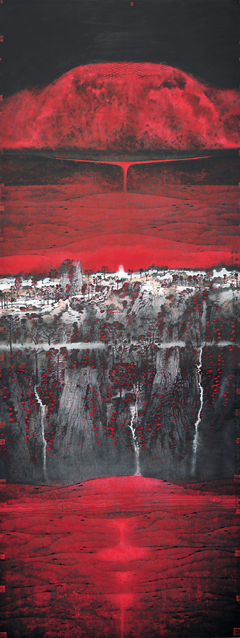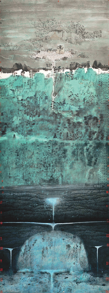 卢禹舜的画,细细品味,常能给人以博大、深沉、凝重、敦厚的感觉。《吕氏春秋》里说天有九野、地有九州。中国自古以来就有九天九地之说,在中国古人的思维里,时空穿越而交织,天地相应而交融。这也许就是卢禹舜天地大象艺术发端的机枢所在。他在笔墨的运用上,也是天地交织、浑然一体,语言是鲜活的,富于创造性的,潇洒而恢宏,可谓洋洋洒洒,酣畅淋漓。