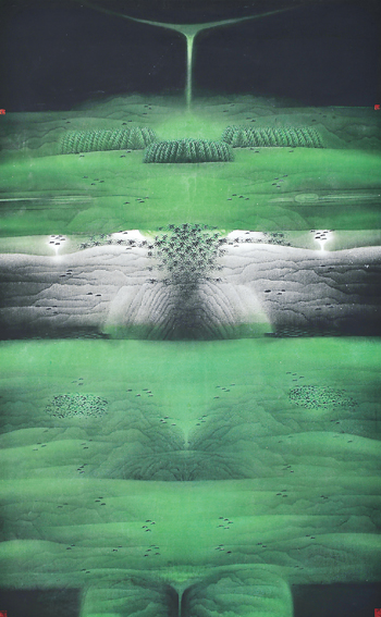 艺术,从来都不是生硬地灌输给他人,而是春雨化泥、润物无声。卢禹舜对中华传统文化有很深的研究。这在他的《乾坤大义》系列作品中便可探知。他的《精神家园》系列作品,也是对中华优秀传统文化的深入开掘、吸收、传承。有了这种植根于本民族优秀传统文化的精神内核,卢禹舜虽然用的是现代笔意,追求的却是传统的温敦、苍茫、悠然、沧桑。他认为,越是现代化的社会,人类越需要这种类似梦幻、原生态的天地大美画卷来安顿人类躁动不安的灵魂。
