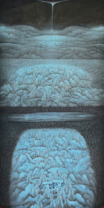 观他的画,不能只沉醉于华丽画面的感官享受中,需进一步挖掘,走进这种如梦如幻、朦胧诗意画境的哲学思想与人文情怀,正所谓文以载道,画以载意。唐代张彦远《历代名画记》云:“夫画者,成教化、助人伦、穷神变、测幽微,与六籍同功,四时并运,发于天然。”卢禹舜的画,到处一片鸿蒙意韵,时空交错,万物交织,不分东西,不辨南北,令人陷入无限的神秘、静穆、空旷、神圣和永恒中,能使人联想到天涯断肠人伫立于猎猎秋风中,悲愁凄婉,有无尽的寂寞和空虚;也能使人感到大自然是美的。