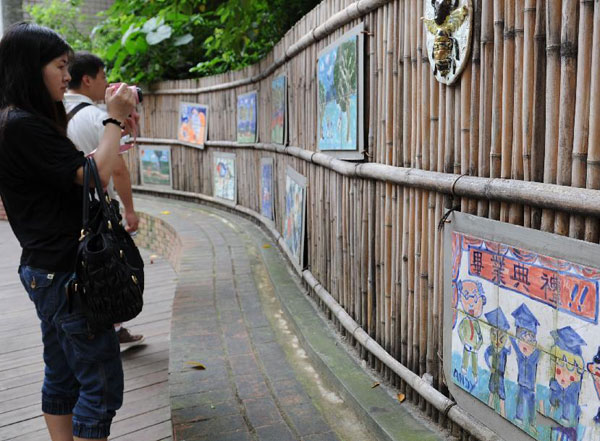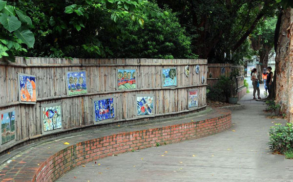台北市萤桥小学的校园围墙别具一格,它们用竹子搭建,造型独特,上面悬挂着学生们创作的艺术作品。