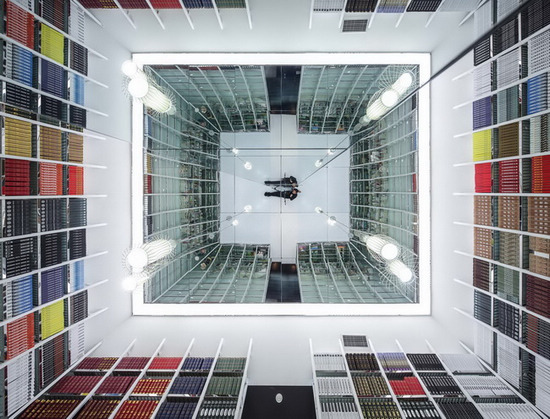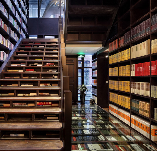 从透明玻璃地板下的书格到两侧如图书馆一般高高耸立的书架,满满当当的陈列让人直观感受到书海的气势。