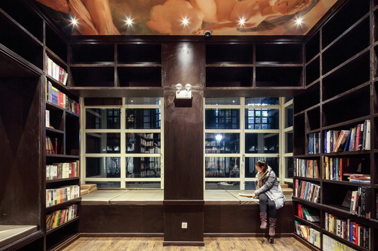 在九宫格黑胡桃木的书架之间,安放了诸多座位,辅以柔软的坐垫,读者可以随时落座,细读手中书卷。