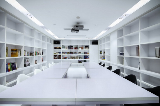 二层设置了一个空间作为书友会与研讨会之用,现代化的影音设备可以从多方面满足这间屋室的使用需求。