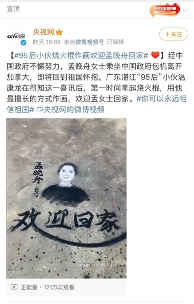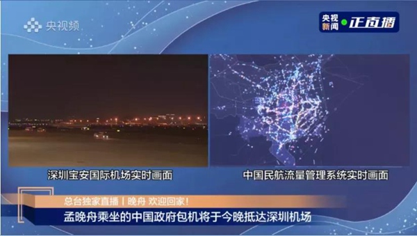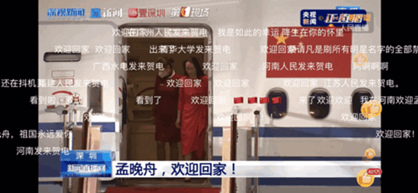 9月25日,中央广播电视总台全程报道了孟晚舟的回家之路。引发了全国网民热烈反响,央视新闻新媒体的直播总观看量近4.3亿,点赞总人次达4亿,超过了美国和加拿大的总人口。