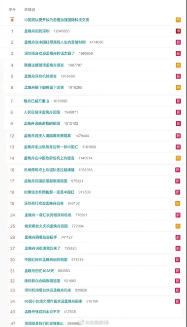 孟晚舟的回家之路被全程直播,国内亿万中国人民在线观看,堪称“年度正能量顶流”。每一个“孟晚舟归国之路”的热搜下,都有微博网友的“热力评论”。